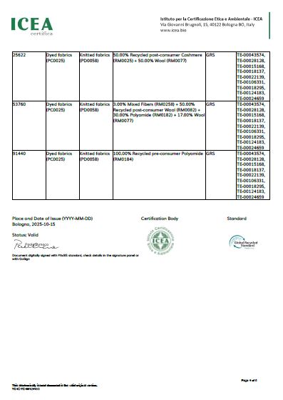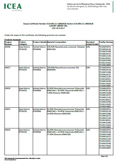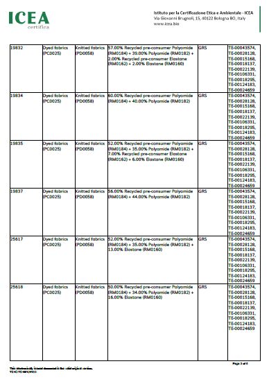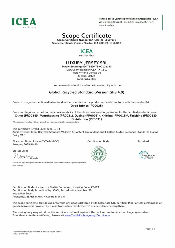 Il GRS prevede il rilascio di una dichiarazione ambientale verificata da parte terza che assicura il contenuto di materiali da riciclo dei loro prodotti, sia intermedi che finiti, il mantenimento della tracciabilità lungo l’intero processo produttivo, le restrizioni nell’uso dei prodotti chimici ed il rispetto di criteri ambientali e sociali in tutte le fasi della filiera produttiva dal riciclo dei materiali, alle successive fasi manifatturiere, fino all’etichettatura del prodotto finito. Le fasi che non rientrano nella certificazione sono la raccolta dei rifiuti, la cernita, selezione e raggruppamento.